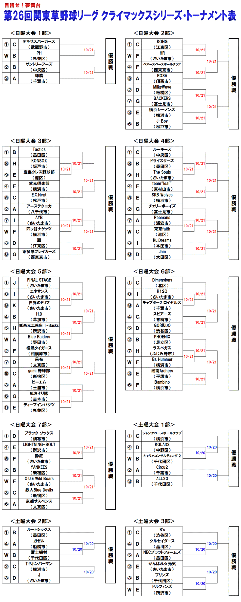 | 第26回関東草野球リーグは 10月14日(日)にレギュラーシーズン全日程を終了し、 優勝戦進出チーム決定戦(通称・クライマックスシリーズ) に進出する全77チームが出揃った。 その顔ぶれを見渡すと、 さすがに一年間の激戦を勝ち抜いてきたチーム同士とあって、 どのチームもチャンスは十分。 優勝戦進出の切符をかけた争いは熾烈を極めそうだ。 そんな中、注目の組み合わせが下記の通り決まった。 試合は、土曜大会は10/20(土)、日曜大会は10/21(日)に行われ、 今年度関東草野球リーグ優勝戦に進出するすべてのチームが決まる。 |
