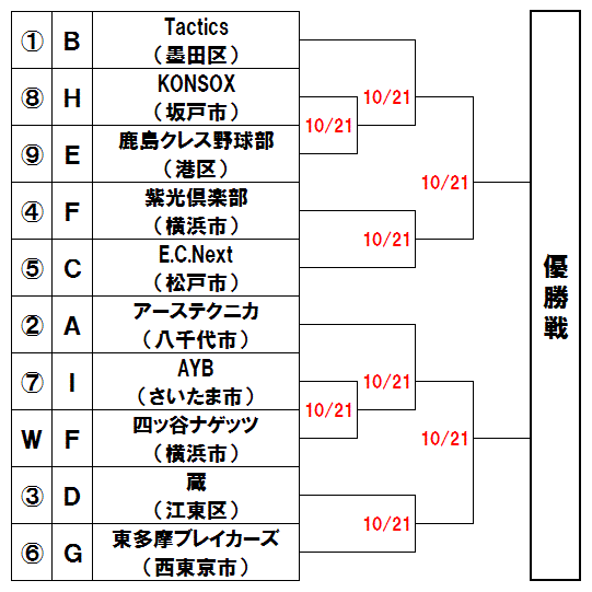 | 上段は打力のあるTactics(墨田区)を紫光倶楽部(横浜市)が、下段は実戦経験豊富なAYB(さいたま市)を蔵(江東区)が追う展開か。 |