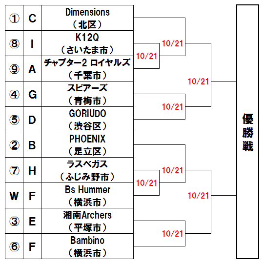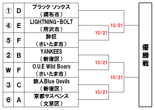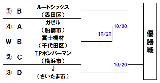 | 例年と同じく飛び抜けたチームがなく、混戦が予想される。上段はLIGHTNING-BOLT(所沢市)が勝ち抜けると見た。下段は鉄人Blue Devils(新宿区)と京都サスペンス(文京区)の勝者の勝ち上がりが有力。 |