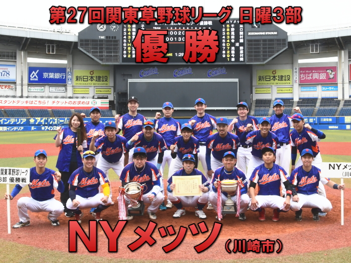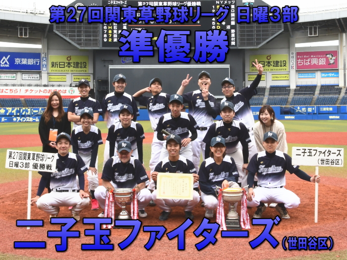 | 二子玉ファイターズは2回、先頭の西沢(裕)が2塁打で出塁し無死2塁とするも後続が倒れ、惜しい先制機を逃す。すると3回、NYメッツはヒットと四球で得たチャンスに3番尾関がタイムリーを放ち、NYメッツが先取点を奪った。点を取られた直後の4回、二子玉ファイターズはヒット3本で1死満塁のチャンスを作ると、7番田村が見事に2点タイムリーを放ちすかさず逆転に成功。だが、NYメッツはその直後に制球難に苦しむ相手投手から3連続四球で無死満塁のチャンスを作ると、その後エラーやワイルドピッチなど度重なるミスにつけこみノーヒットで3点を奪い再逆転に成功。結局、NYメッツがこのリードを守り逃げ切った。 |