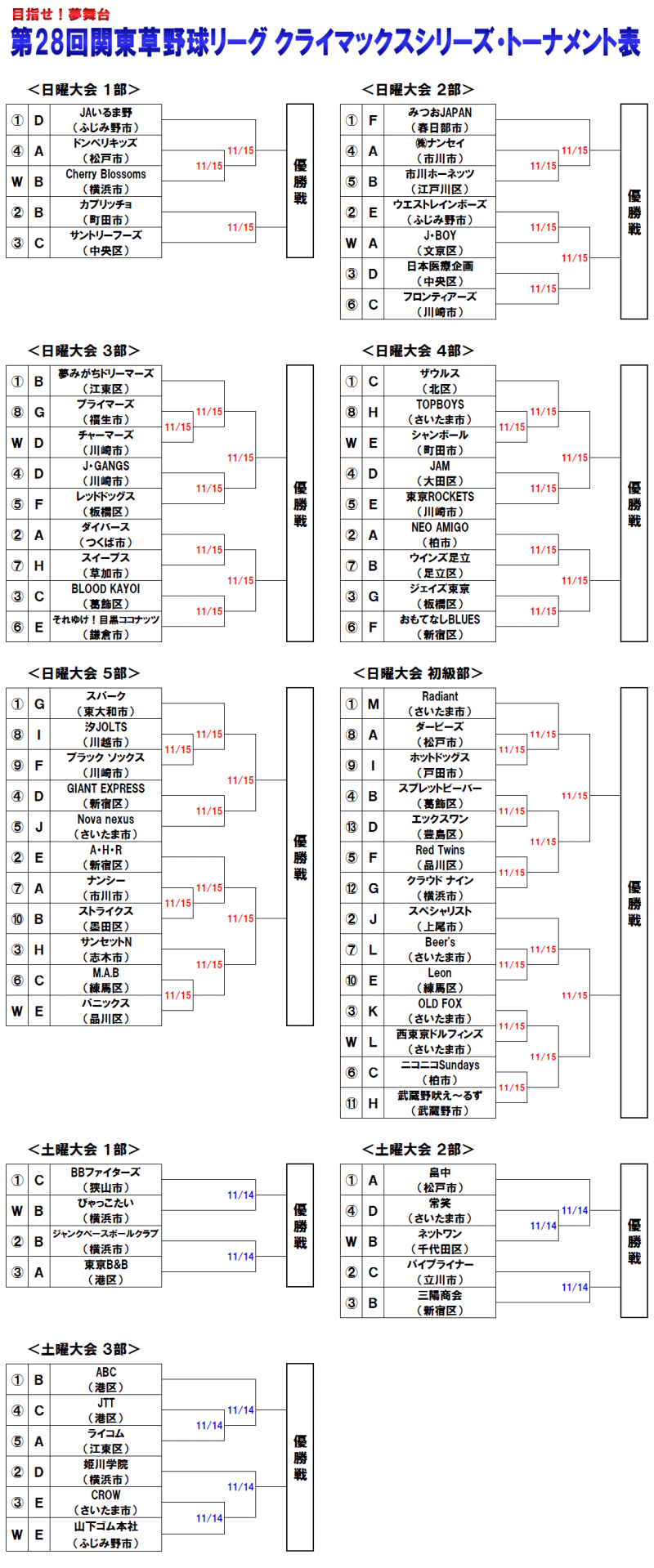 | 第28回関東草野球リーグは 11月8日(日)にレギュラーシーズン全日程を終了し、 優勝戦進出チーム決定戦(通称・クライマックスシリーズ) に進出する全70チームが出揃った。 その顔ぶれを見渡すと、 さすがに一年間の激戦を勝ち抜いてきたチーム同士とあって、 どのチームもチャンスは十分。 優勝戦進出の切符をかけた争いは熾烈を極めそうだ。 そんな中、注目の組み合わせが下記の通り決まった。 試合は、土曜大会は11/14、日曜大会は11/15に行われ、 今年度関東草野球リーグ優勝戦に進出するすべてのチームが決まる。 |