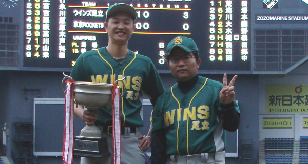 | 「今日は優勝戦ということで勝ちにいくオーダーを最初は組みましたが、メンバーも多かったので、いろいろと考えながら選手を起用しました。結果、全員を出場させることが出来て、しかも優勝も出来てとても嬉しく思います。今日の試合もそうでしたが、うちは守り重視のチームなので、一年間を通じて投手陣の頑張りには本当に感謝したいです。マリンスタジアムは素晴らしい舞台でした。今年はこうして4部で優勝という最高な形で終われました。うちらしい野球を来年も継続したいですね」 |