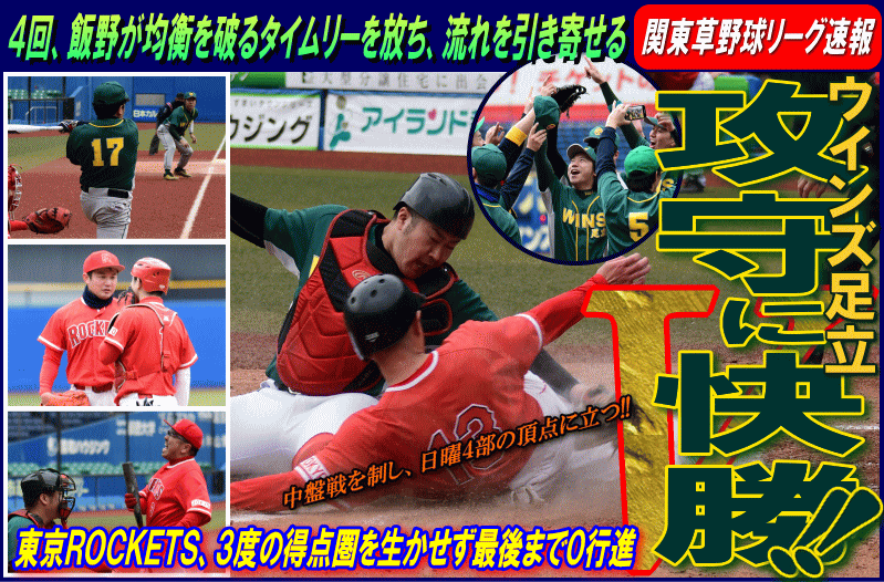 | ウインズ足立が中盤戦を制し、日曜4部優勝を決めた。試合が動いたのは4回。ウインズ足立は無死2・3塁のチャンスで、このところ打撃不振だった6番飯野がレフトにタイムリー2ベースを放ち、2点を先制する。5回には2死2・3塁の場面で、途中出場の栗原がタイムリーを放ち勝負を決めた。一方の東京ROCKETSは、初回に3番川本、4番大圖の連打で2死2・3塁のチャンスを作るも無得点。3回には1死1・3塁から、内野ゴロの間に果敢にホームを狙うも間一髪で本塁憤死。いずれも先取点のチャンスに得点が奪えず、最後まで流れに乗れなかった。 |