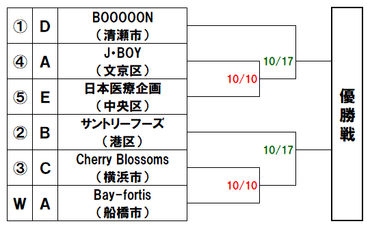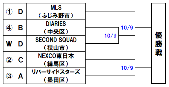 | 上段は、平均年齢45歳ながら安定したチーム力を誇るMLS(ふじみ野市)が一歩リードか。エース尾坂を中心に守りが堅く総合力が高い。初戦を勝てばMLSと当たる2チームも力がある。DIARIES(中央区)とSECOND SQUAD(狭山市)の対決はともに強力打線が持ち味。1点を争う勝負になりそうだ。下段は、この階級の優勝候補の筆頭・NEXCO東日本(練馬区)にリバーサイドスターズ(墨田区)挑む形か。リバーサイドスターズはレギュラーシーズンで好投した投手陣が踏ん張り競り合いに持ち込みたい。 |
