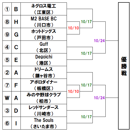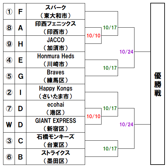 | 絶対的な優勝候補は不在だが、初戦から好カードが多い組み合わせとなった。上段では、エース黒田の投球が楽しみなHonmura Heds(川崎市)と主砲・宮口をはじめ活発な打線が売りのBraves(練馬区)との対戦は楽しみなカード。この勝者と安定感のある投球を見せる池嶋を擁する印西フェニックス(印西市)による上段ゾーンの代表争いになりそう。下段は、総合力の高いHappy Kongs(さいたま市)が中心となりそう。これを追うのは石橋・森(大)・古屋ら勝負強い打者が揃う石橋モンキーズ(台東区)と見られるが、初戦の攻守にまとまるストライクス(墨田区)戦が難関。 |