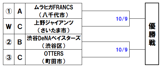 | 混戦の中で、OTTERS(町田市)がV最右翼とみる。勝負強い津田・斎藤らを軸とした攻撃力はこの階級でも上位だ。対する渋谷DeNAベイスターズ(渋谷区)は主砲・豊田を中心とした打線の粘りで対抗したい。上段のムラヒガFRANCS(八千代市)は攻守の要・笠原に注目。ワイルドカードの上野ジャイアンツ(さいたま市)は堅守が持ち味。 |