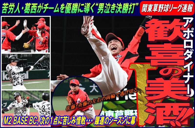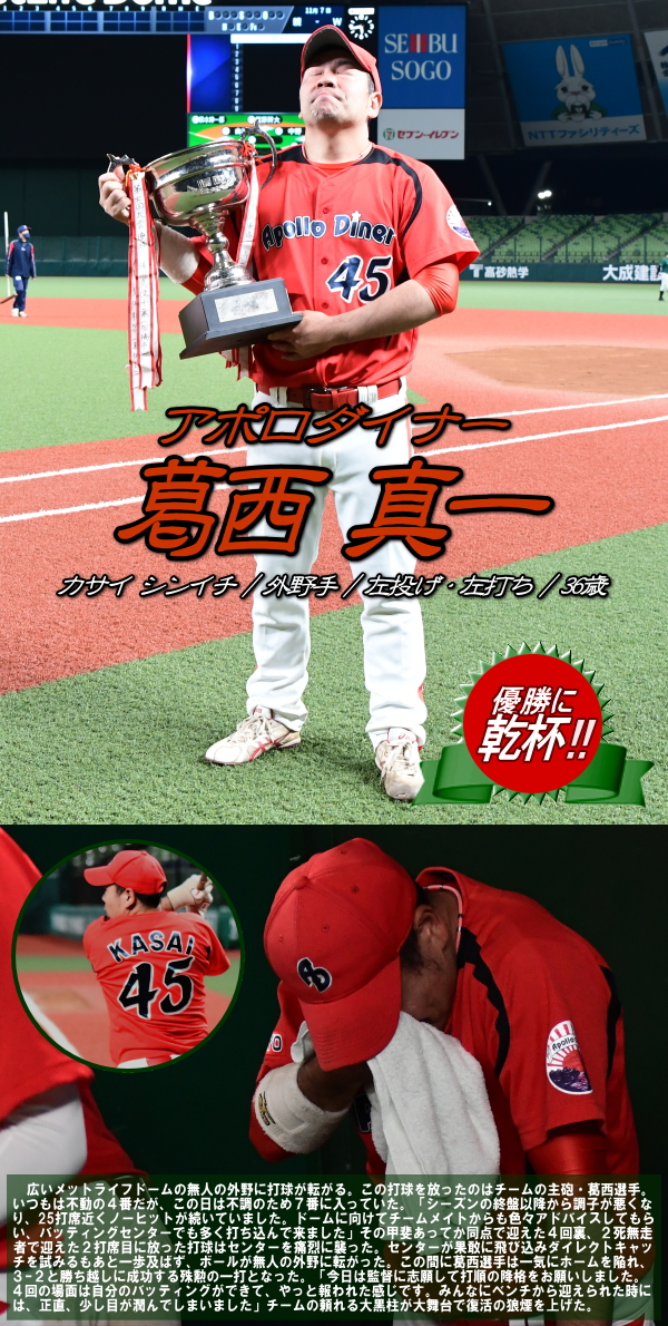 BASE BCは3回2死から得点圏にランナーを進めると、5番東の同点タイムリーで試合を振り出しに戻す。追いつかれたアポロダイナーは4回に勝ち越す。2死から、シーズン終盤戦から極度の不振が続いていた7番葛西が放った打球はセンターを襲うライナー性の当たり。これをセンターが果敢に飛び込みダイレクトキャッチを試みるもわずかに及ばず、ボールが無人の外野を転々とする間に、打った葛西が一気にホームイン。3-2と勝ち越しに成功した。粘るM2