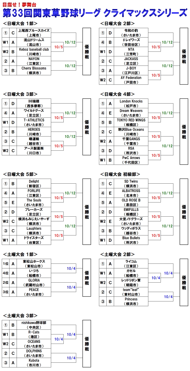 | 第33回関東草野球リーグは9月28日(日)にレギュラーシーズン全日程を終了し、 優勝戦進出チーム決定戦(通称・クライマックスシリーズ)に進出する全52チームが出揃った。 その顔ぶれを見渡すと、さすがに一年間の激戦を勝ち抜いてきたチーム同士とあって、 どのチームもチャンスは十分。優勝戦進出の切符をかけた争いは熾烈を極めそうだ。 そんな中、注目の組み合わせが下記の通り決まった。 試合は土曜大会は10/4(土)、日曜大会は10/5(日)と10/12(日)の2日間の日程に分けて行われ、 今年度関東草野球リーグ優勝戦に進出するすべてのチームが決まる。 |