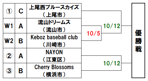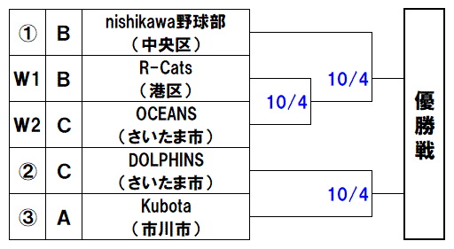 | nishikawa野球部(中央区)は勝ちにこだわらない野球を掲げ楽しみながらレギュラーシーズンを戦ってきた。投打に躍動した土谷の活躍に注目。1回戦からの登場のR-Cats(港区)は主砲・下薗が打線を引っ張り守りも固い。対するOCEANS(さいたま市)は打線に切れ目がなく、高打率の中軸で突破口をつくりたい。下段は強力打線で得点力があるDOLPHINS(さいたま市)がやや優位か。安居院監督率いるKubota(市川市)は試合巧者。堅守で接戦に持ち込めば勝機が見える。 |
