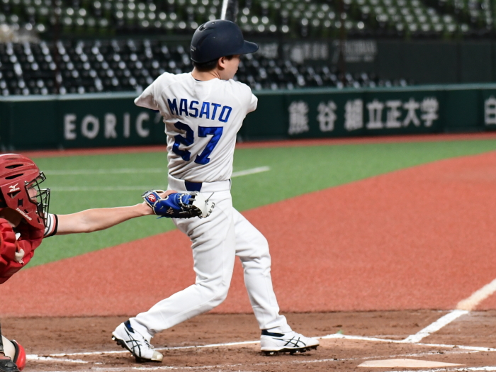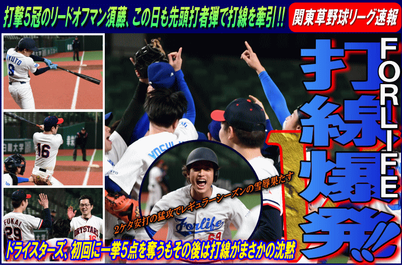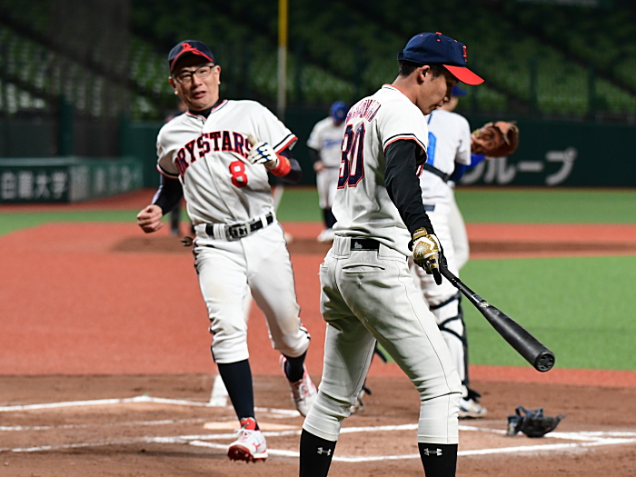 | FORLIFEは1回表、先頭の1番・須藤が初球をいきなりレフトへ本塁打を放ち1点を先制。さらに次打者が内野失策で出塁すると2塁へ盗塁を決め無死2塁と追加点のチャンスを作る。1死後迎えた4番・米望(正)がセンター前にタイムリーヒットを放ちこの回計2点を先制する。追うドライスターズは直後の1回裏にすぐさま反撃する。先頭の竹内(駿)が四球で出塁すると内野ゴロで2塁へ進んだ後、3番・輿水のライトへの打球が失策を誘いまず1点を返す。さらにその後内野失策で1・2塁とした後、5番・山本の内野安打の間に2塁走者が生還し2−2の同点に追い付く。その後2死となるもここで迎えた7番・伊藤がセンターの頭上を越えるランニングホームランを放ち3点を追加。この回計5点を挙げドライスターズが一気に試合をひっくり返した。追うFORLIFEの反撃は3回。四球とヒット、盗塁で2死ながら2・3塁とした後、迎えた8番・日色がレフト前に2点タイムリーヒットを放ち4−5と1点差に詰め寄る。FORLIFEは4回には2つの失策の間に1点を返し同点とした後、続く5回には2死2塁から1番・須藤がセンターオーバーのタイムリー2塁打を放ち1点を勝ち越す。さらにその後四球と内野悪送球の間に2点を追加しこの回計3点。8−5と逆転に成功した。試合は結局FORLIFEがこのリードを最後まで守り切った。 |