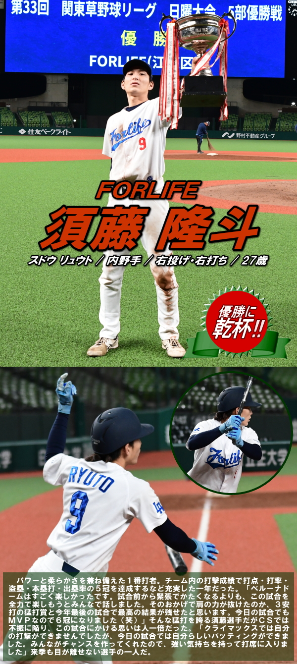 | 「緊張から今日の試合では守備面が今年一年の試合では一番酷かったのですが、打ち勝って優勝することができました。ドライスターズさんとはグループ戦で対戦をしていてチーム力が高いと知っていました。その時は1点差で負けたので今回はリベンジが出来ました。クライマックスの2回戦ではわたしが不在ながら、代表の柳(諒)を入れて9人での戦いでしたが、厳しいゲームに勝ってくれました。このような舞台を用意してもらったメンバーには感謝したいです。来年も打撃に力を入れて、さらに得点が奪える打線を作りたいと思います」 |