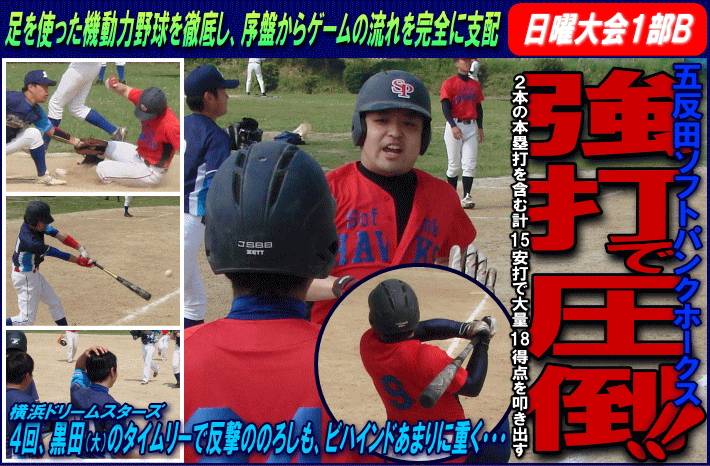 | 五反田ソフトパンクホークス(品川区) | 18 | × | 4 | 横浜ドリームスターズ(横浜市) | ||