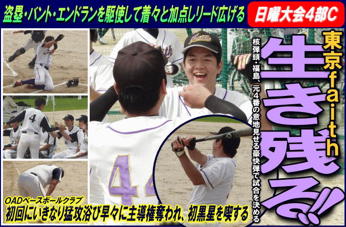 | 東京faith(港区) | 7 | × | 2 | OADベースボールクラブ(大田区) | ||
