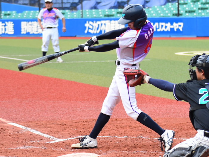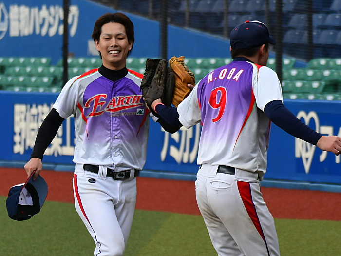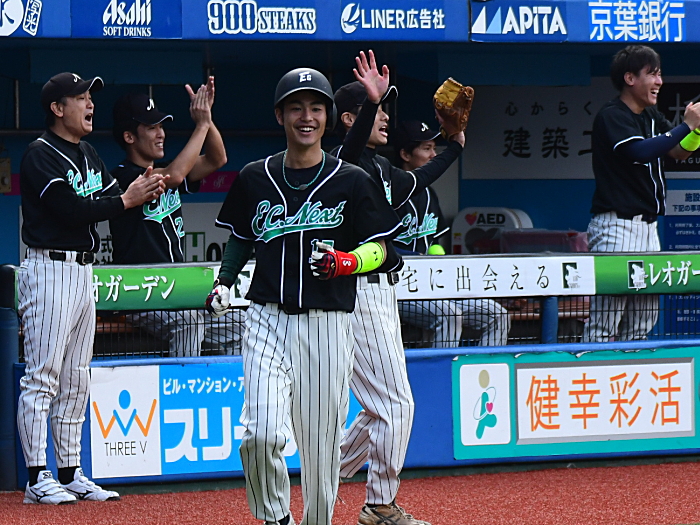 | たった1つのミスが明暗を分けた。最初にチャンスを作ったのはE.C.Next。2回、この回先頭の4番佐藤が3塁打で出塁するが、ここはアーステクニカ先発・高橋が後続を連続三振と内野ゴロに仕留め無得点に終わる。E.C.Nextは続く3回にも先頭が四球を選び出塁するが、2盗失敗で得点には至らない。一方のアーステクニカも3回には1死2塁、5回には初ヒットで7番高橋が出塁するも攻めきれず、スコアボードには双方0が刻まれていく。そんな中、重い均衡が破れたのは5回。E.C.Nextは相手エラーで出たランナーを2死ながら3塁に置き、ここで9番白木が鮮やかに右中間を破るタイムリー2ベース。待望の1点をもぎ取った。追うアーステクニカも最終回に2死から再び高橋が2塁打で出塁し一打同点の場面を作るが、最後のバッターが倒れゲームセット。E.C.Nextが虎の子の1点を守り切った。 |
