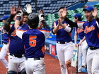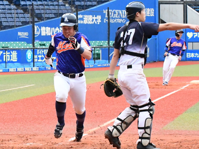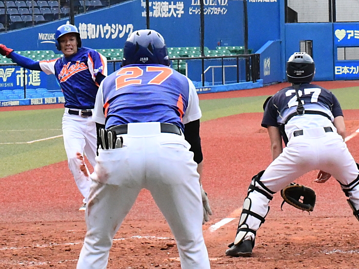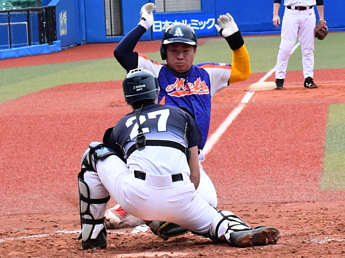 | 二子玉ファイターズは2回、先頭の西沢(裕)が2塁打で出塁し無死2塁とするも後続が倒れ、惜しい先制機を逃す。すると3回、NYメッツはヒットと四球で得たチャンスに3番尾関がタイムリーを放ち、NYメッツが先取点を奪った。点を取られた直後の4回、二子玉ファイターズはヒット3本で1死満塁のチャンスを作ると、7番田村が見事に2点タイムリーを放ちすかさず逆転に成功。だが、NYメッツはその直後に制球難に苦しむ相手投手から3連続四球で無死満塁のチャンスを作ると、その後エラーやワイルドピッチなど度重なるミスにつけこみノーヒットで3点を奪い再逆転に成功。結局、NYメッツがこのリードを守り逃げ切った。 |