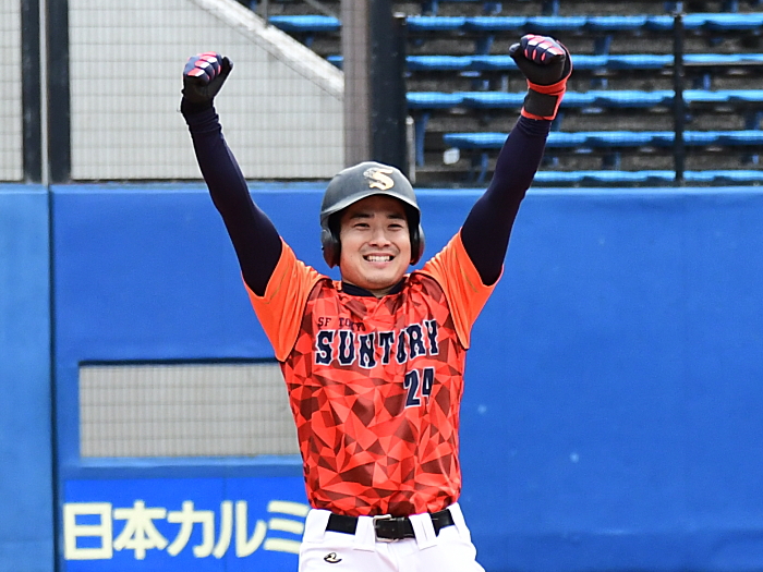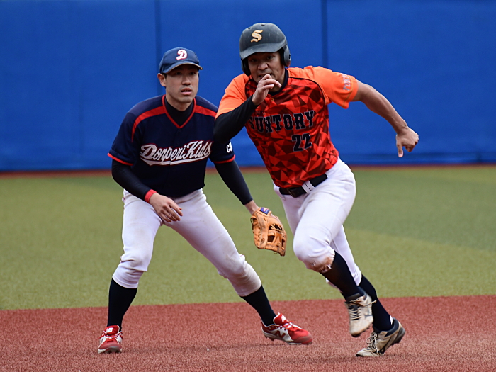 | サントリーフーズが優勝戦進出4度目にして、ついに念願だった日曜大会を制覇した。サントリーフーズは初回、今大会を沸かせている1番稲場が四球を選ぶと、俊足を生かしすかさず2盗。2番堀尾の進塁打で1死3塁とすると、ここで3番鈴木が鮮やかにライト前へタイムリーを放ち、幸先良く1点を先取する。さらに5番金子もタイムリー2ベースで続き、この回2点を先制した。サントリーフーズは4回には代打・吉武のタイムリー3ベースで貴重な追加点。投げては金子から藤元へとつなぐ投手リレーでドンペリキッズ打線を散発の3安打に封じ、見事な完封勝利。敗れたドンペリキッズは、初回の1死2塁、4回の1死3塁、7回の無死1・2塁といずれのチャンスも生かすことができず、最後までホームが遠かった。 |