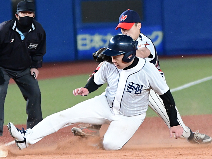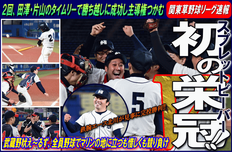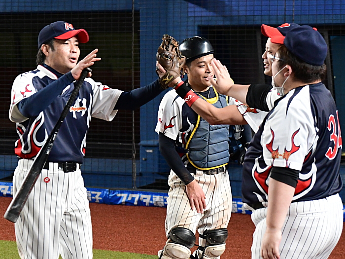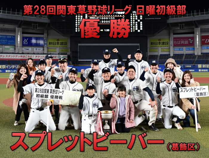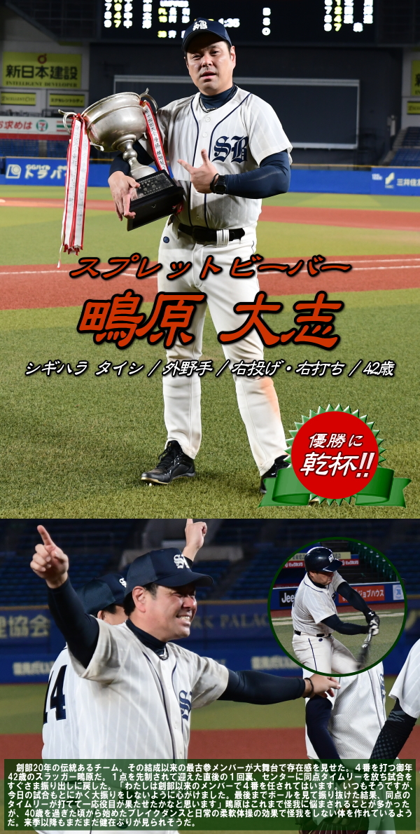 | 試合は初回から動く展開となった。先攻の武蔵野吠え〜るずは1番高橋が死球で出塁。盗塁と送りバントで1死3塁とすると、ワイルドピッチで労せずして1点を先取する。その裏のスプレットビーバーも併殺崩れのランナーを2塁に置き、4番鴫原がセンターにタイムリー。すぐさま試合を振り出しに戻した。勢いの乗ったスプレットビーバーは2回には、7番田澤、2番片山のタイムリーで追加点を挙げ、4-1とリードを広げる。一方の武蔵野吠え〜るずの反撃は5回。四球とヒットでチャンスを作ると、9番中澤のタイムリーで1点を返すが反撃はここまで。創部20周年を迎えたスプレットビーバーが、メモリアルイヤーに初の栄冠を掴んだ。 |