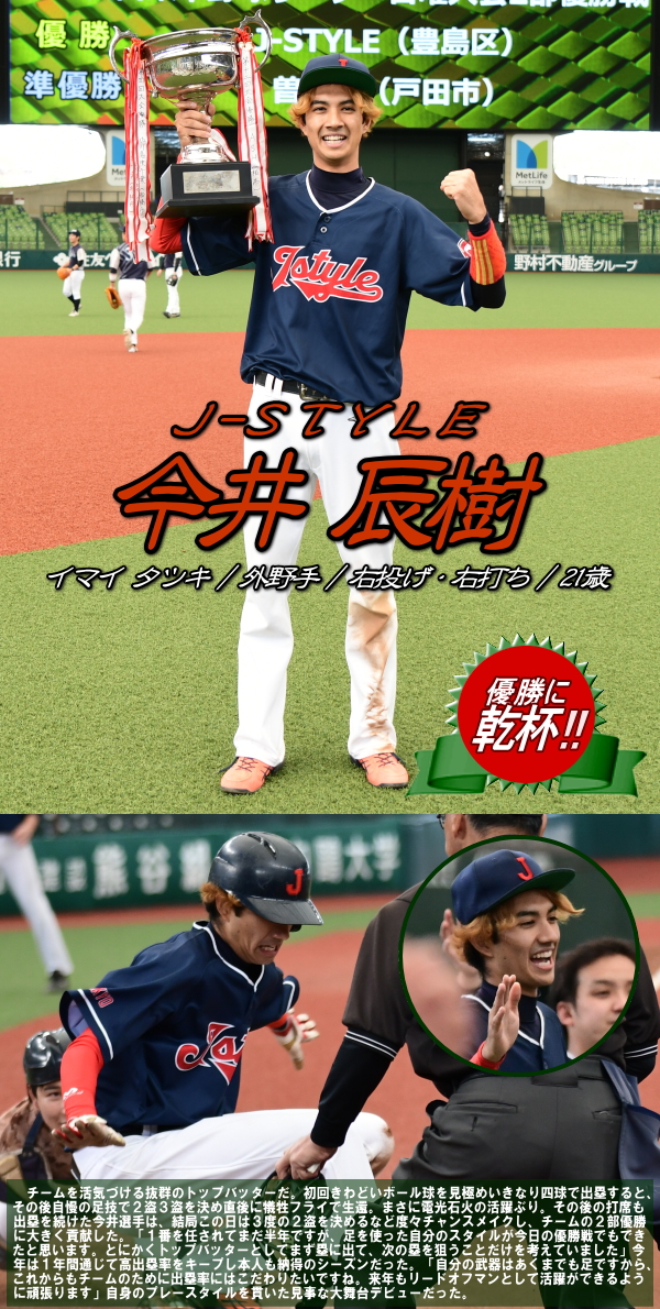 しかしJ-STYLEさんの5人の投手陣は全員が力のあるボールを投げていて、全く手が出せませんでした。打線にも勢いがありましたしね。今日の負けを真摯に受け止めて、来年は今年以上に投打に磨きをかけて毎試合臨みたいです。またドームで試合ができるように頑張ります」 |