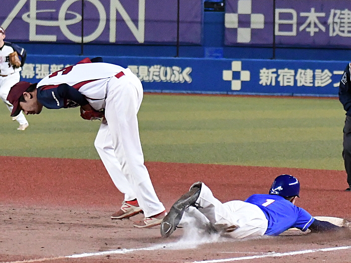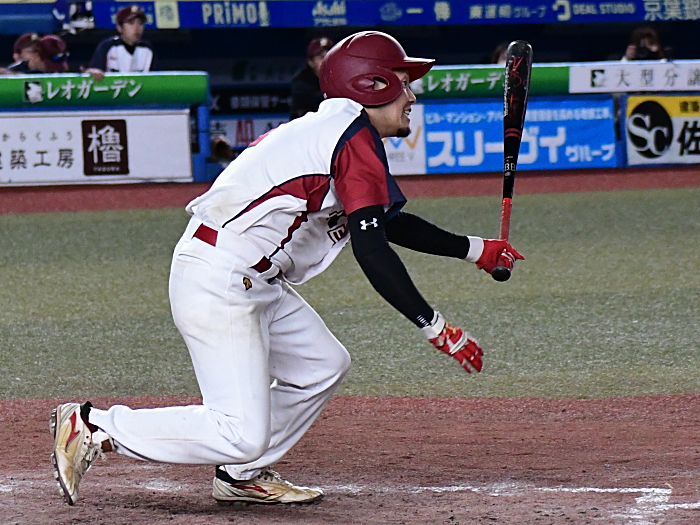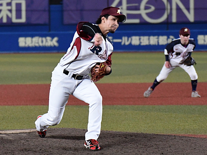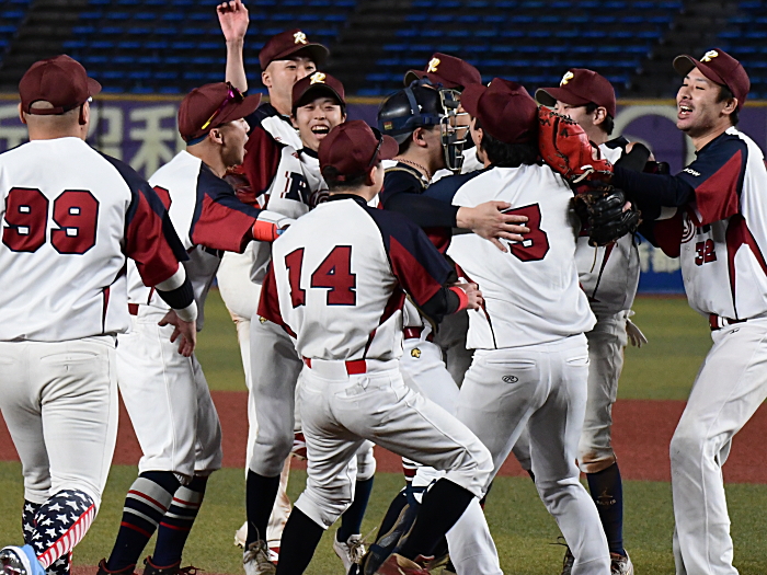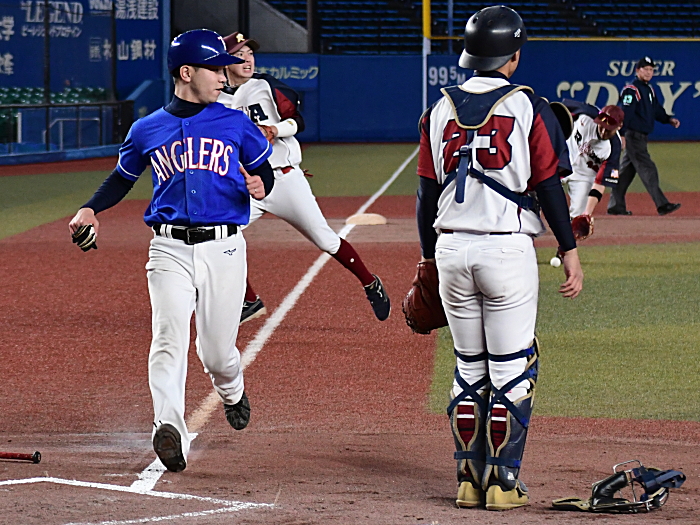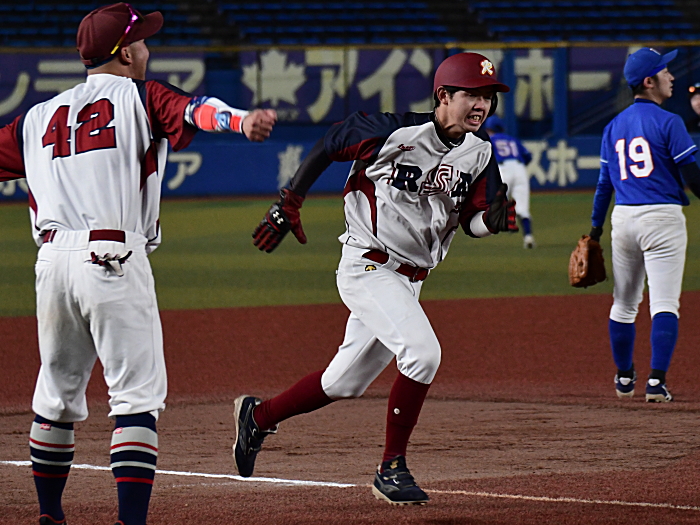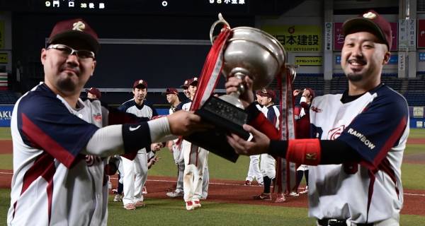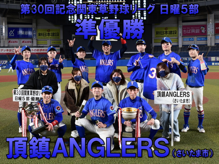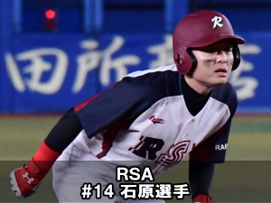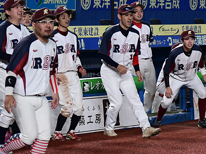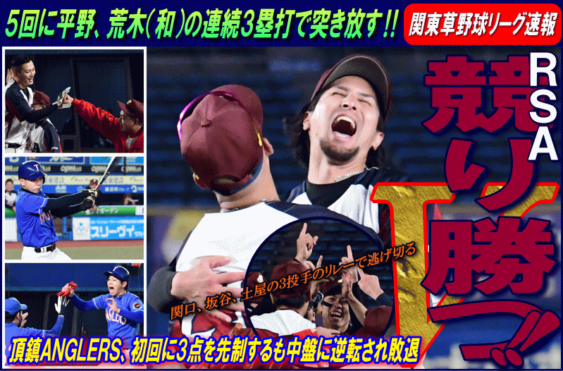 | 頂鎮アングラーズは1回裏、無死1,2塁から3番・大内のライトへのタイムリー3塁打でまず2点、その後相手エラーで1点を加えいきなり3点を先制する。追うRSAは2回表、1死2塁のチャンスを作ると、7番・石原のレフト前タイムリーヒットでまず1点を返す。さらに2死2塁から相手エラーで1点を加え2−3と1点差に詰め寄る。さらにRSAは3回にも相手エラーの間に1点を奪い3−3の同点に追いつく。RSAは5回表にも1死から1番・平野の左中間への3塁打、2番・荒木(知)も逆転打となるタイムリー3塁打で続き、ついに4−3と試合をリードする。さらに2死後相手エラーでもう1点を追加し5−3と2点差とする。追いつきたい頂鎮アングラーズはその裏、四死球で満塁とすると内野ゴロの間に1点を返し5−4と1点差まで迫る。しかし反撃もここまで。RSAが1点差を守り日曜5部の頂点に立った。 |