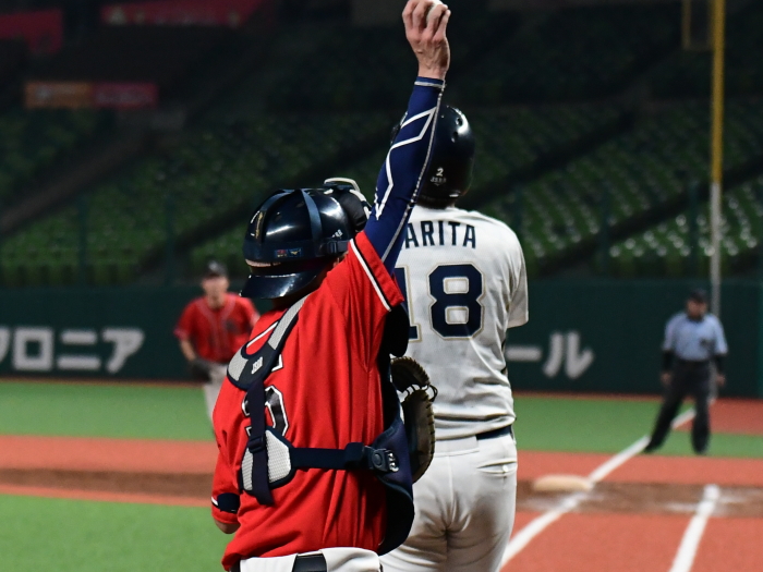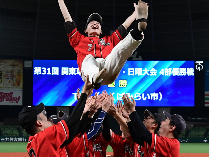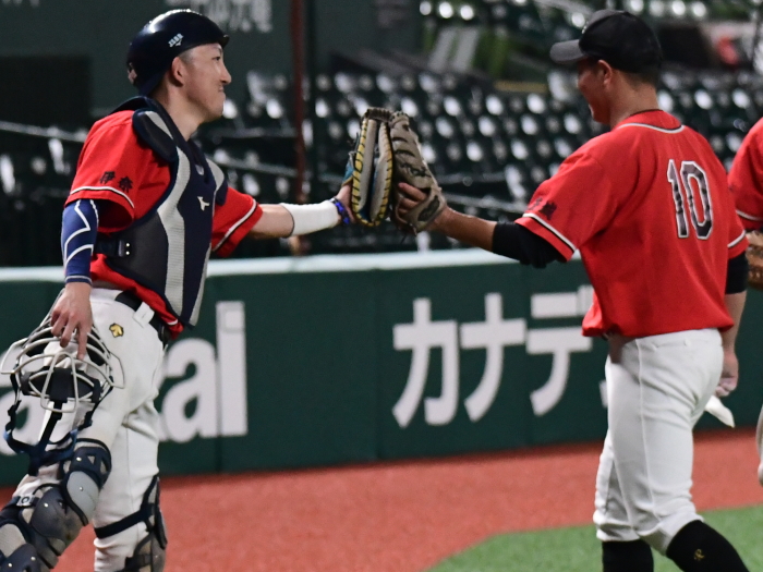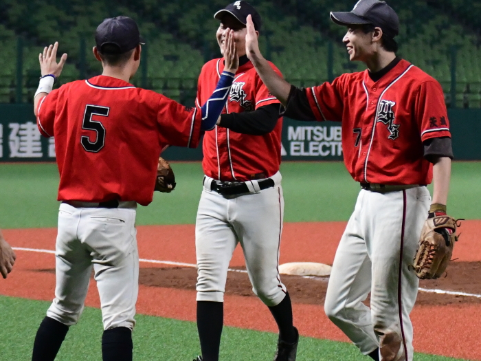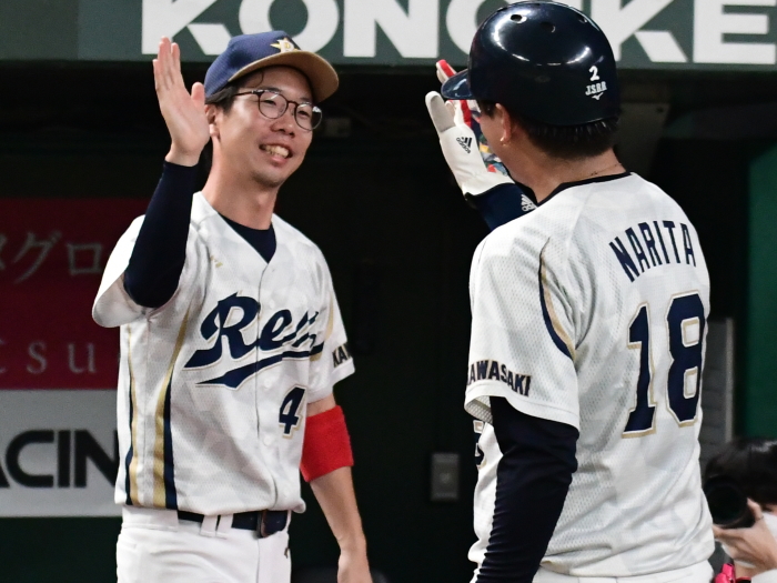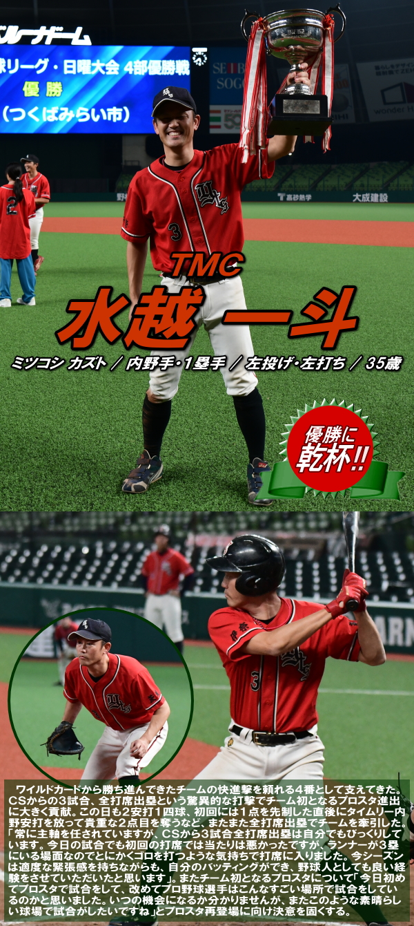 | 「今日はとにかく楽しんでベルーナを満喫しようと試合前に話をしました。プレッシャーを感じることも無くみんなが野球を楽しんでいましたね。 勝因としては初回に2点を先制できたことで試合を優位に進められたことだと思います。エースの古谷も相変わらず安定した投球内容で四死球も1つでしたので、野手陣がリズム良く守れたことも大きかったと思います。ここまで来た道のりは人数集めなど苦しかったこともありましたが、みんなでカバーをしながらようやくたどり着けました。優勝できて嬉しいです。今後は今日怪我のために出場ができなかった山口選手のためにも、もう一度このような素晴らしい球場で試合がしたいですね」 |