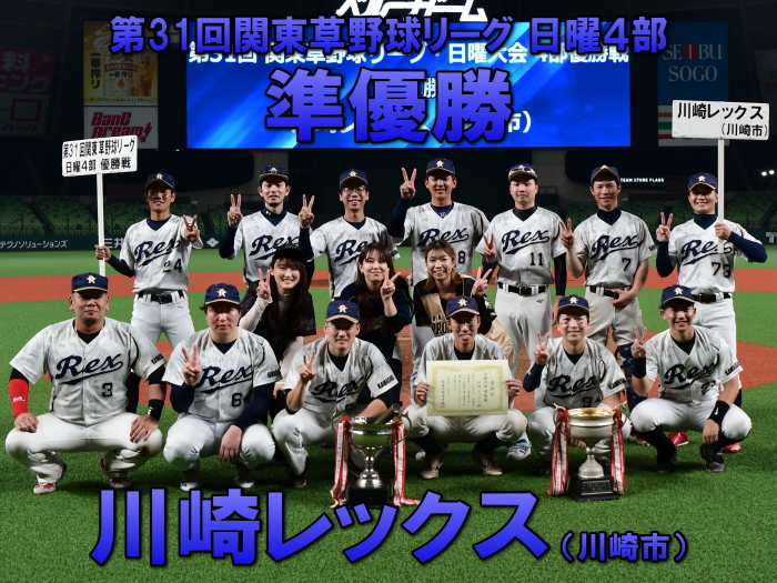 | TMCは1回裏、1死1塁から3番・仮屋の右中間へのタイムリースリーベースと4番・水越の内野ゴロの間に2点を先制する。追いつきたい川崎レックスは4回表、2死3塁の好機に主砲・梅澤がセンター前タイムリーヒットを放ち1点を返す。追い上げられたTMCはその裏、ヒットと死球で1死1,2塁のチャンスを作ると、その後併殺崩れの間に2塁ランナーが生還して貴重な3点目を奪う。その後両チームともにチャンスを作るも、TMC古谷、川崎レックス駒崎の両先発投手が得点を許さずそのまま試合終了。TMCが3−1で川崎レックスを下し日曜4部の頂点に輝いた。 |
