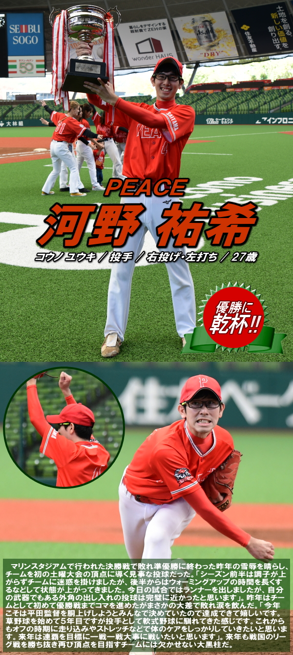 | 「今日の敗因は先制点が奪えなかったことと、失点が四球からだったので改めて野球の怖さみたいなものを感じました。うちの右投手に対してPEACEさんの左打者に4本のヒットを打たれましが、中に入ってくるボールを完全にとらえられてしまいました。言い訳が無いくらい投打に完敗でした。普通に試合をしたら今のうちではPEACEさんに勝てないと思うので、今後もPEACEさんを目標に戦術を練り工夫をしてPEACEさんに勝つことを目標にしたいと思います。今日は悔しい結果に終わりましたが、今後の課題が見つかりましたので、来期に向けて全体練習などで克服したいと思います」 |