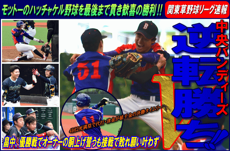 | 試合が動き出したのは2回。畠中は先頭打者が相手エラーで出塁すると、1死後スコアリングポジションに走者を置き、7番・海野がレフトへタイムリーヒットを放ち1点を先制。さらに後続もヒットで出塁し、1死1,3塁とすると9番・浅野がライトへの犠牲フライを放ち2点目。2−0とする。追いつきたい中央バンディーズはその裏、ヒットと四球で1死1,3塁のチャンスを作ると、7番・小松が犠牲フライを放ち1点を返す。中央バンディーズはさらに4回裏、先頭打者が四球で出塁すると、その後一旦併殺でチャンスを潰すが、そこからしぶとく2連続ヒットと四球で2死満塁とする。この好機に登場した代打・津金が値千金となる技ありのタイムリーヒットを放ち2者が生還、3−2と逆転に成功する。結局このリードを最後まで守り切った中央バンディーズが強敵相手に鮮やかな逆転勝利を飾った。 |