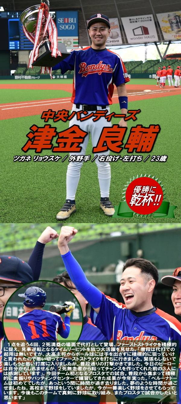 | 「実力的には畠中さんの方がキャリアなども考えると断然上ですが、今日の試合では流れの持って行き方と言うか、流れが良かったと思いますね。また見逃しの三振でも良いから相手投手の高め、低めは一切捨てて甘い球だけを待つようにと試合前にみんなに伝えました。ヒーローは津金でしたが2死から四球などで満塁のチャンスを作った前の3人は本当に良くつないでくれました。来年はもっと強いチームと試合をしますが、若さを全面に出して強い気持ちで毎試合臨みたいと思います。ベルーナドームでも今年1年のチームカラーであるハッチャケルが達成出来たことも嬉しかったですね」 |