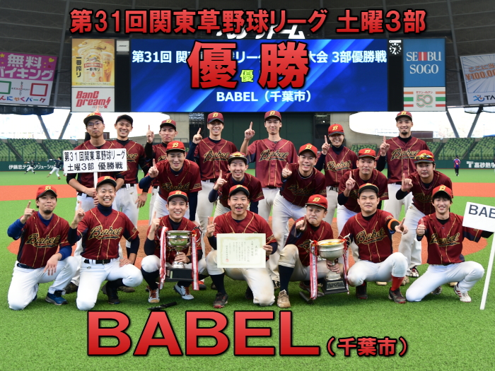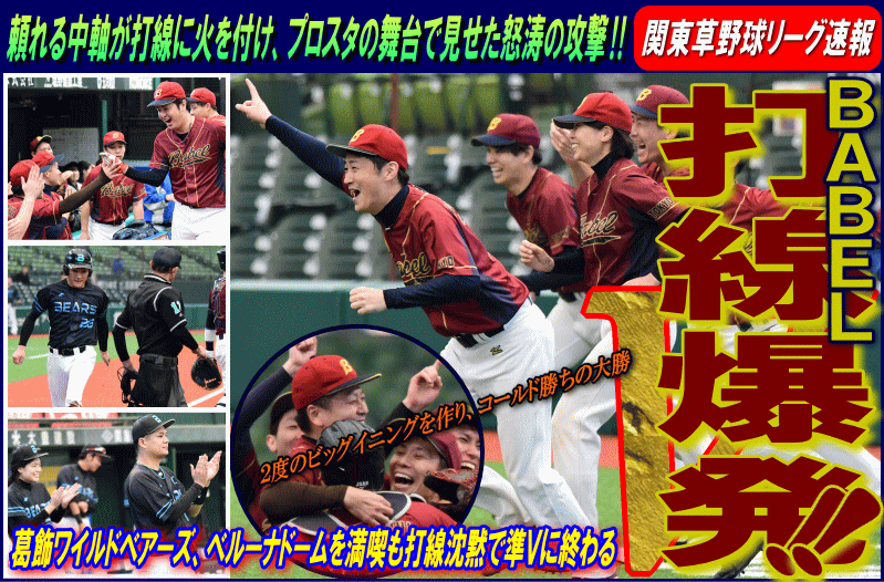 | BABELは2回、1死から2つの四球と内野安打で満塁とすると、ここで主砲・齋藤が走者一掃となるレフトフェンス直撃のタイムリー3ベースを放ち3点を先制。さらにその後も次々にタイムリーヒットが飛び出し結局この回一挙に7点を奪う。追う葛飾ワイルドベアーズはその裏、1死から四球とエラーで1・2塁とすると、1番・大塚がチーム初となるヒットがタイムリーとなり1点を返す。しかし追加点が欲しいBABELは5回、内野安打とエラーで1死1,2塁とすると,1番・川村がセンターオーバーとなるタイムリー2塁打を放ちまず2点。さらにその後も4番・小林、5番・森下らのダメ押しとなるタイムリーヒット等でさらにリードを広げ、この回計5点を奪い12−1とし勝負を決めた。 |
