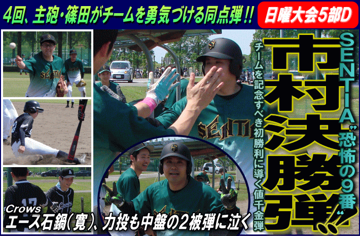 | 試合は初回から動く。1回の表のSENTIAは、1番松本がライトへの2ベースで出塁するとその後3進しホームスチールで1点を先制。対するCrowsはその裏、バッテリーエラーですぐさま同点とすると、さらに5番平のライト前タイムリーでi一気に逆転に成功した。追うSENTIAの反撃は4回。4番篠田が同点ソロ弾を放ち流れを引き寄せると、続く5回にはランナーを一人置き、9番市村が3塁線を痛烈に破る2ランホームラン。結局これが決勝点となり、SENTIAが記念すべきチーム結成初勝利を手にした。一方、敗れたCrowsは毎回のようにランナーを出塁させるもSENTIAのエース照井の緩急の前に決め手を欠き2回以降は0行進。力投を続けた石鍋(寛)を援護できなかった。 |