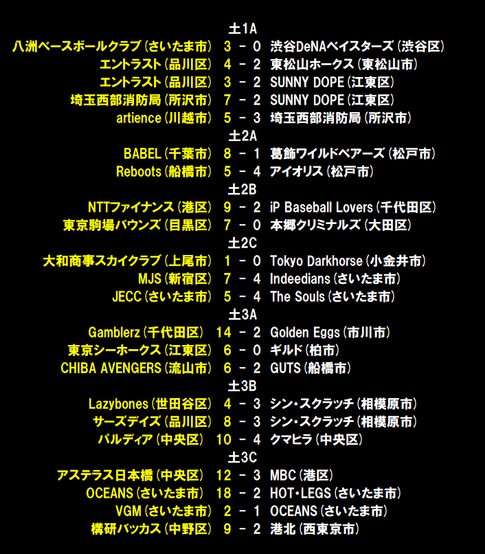 | Guffは初回に市川の先頭打者アーチで先制すると、その後も7番猪熊が2死満塁のチャンスで2点タイムリーを放ち3点を先制する。2回には相手投手の乱調から4つの押し出しで4点を奪うと、なおも満塁の好機で7番猪熊が6打点目となる満塁弾を放ち、一挙8点を奪う猛攻でさらにリードを広げる。一方の赤坂エルマーノスは3回に1番今宿のヒットなどで2死1、3塁も後続が倒れ無得点。Guffは3回にはこの日チーム3本目となる小林の本塁打でダメ押し。コールド勝ちを決めた。負けた赤坂エルマーノスは最後まで打線がつながらず、今季5敗目を喫した。 |