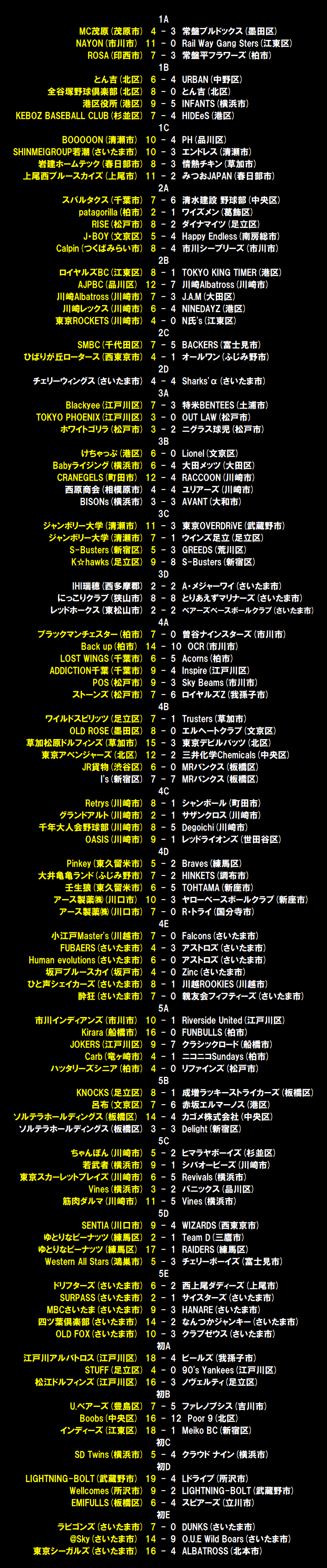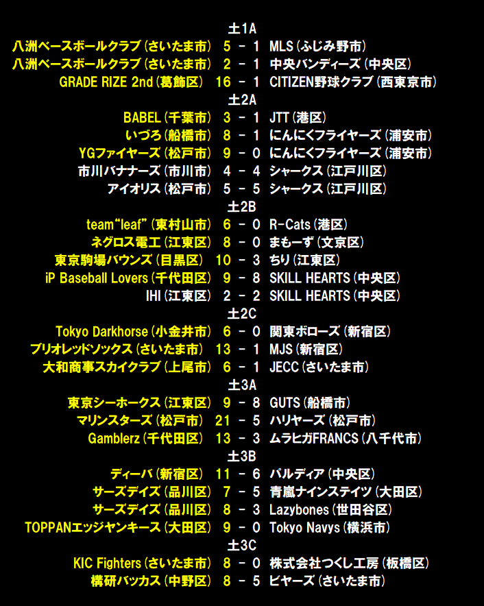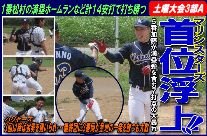 | マリンスターズは初回に2死から3番加瀬がツーベースを放つと、相手の悪送球も重なり先制点を奪う。一方のハリヤーズはその裏、2番岩田がヒットで出塁すると、4番高野、5番時田に連続タイムリーが飛び出し逆転に成功。1点を追うマリンスターズは3回に3つの四球で1死満塁のチャンスを作ると、5番加藤が2点タイムリー、続く6番田中もタイムリーを放ち再逆転に成功。ハリヤーズはその裏に2死満塁とするとワイルドピッチで1点を返し4-3とする。1点リードのマリンスターズは4回に1番松村の満塁弾などで一挙5点を奪いリードをさらに広げる。最終5回には5番加藤がこの試合7打点目となる満塁ホームランを放つなど打者16人を送り込む猛攻で11得点を奪う。後の無いハリヤーズは2番岩田がヒットで出塁すると、3番岡が意地の一発を放ち2点を返すも、反撃はここまで。打ち勝ったマリンスターズが8試合を終えて暫定首位に浮上した。 |