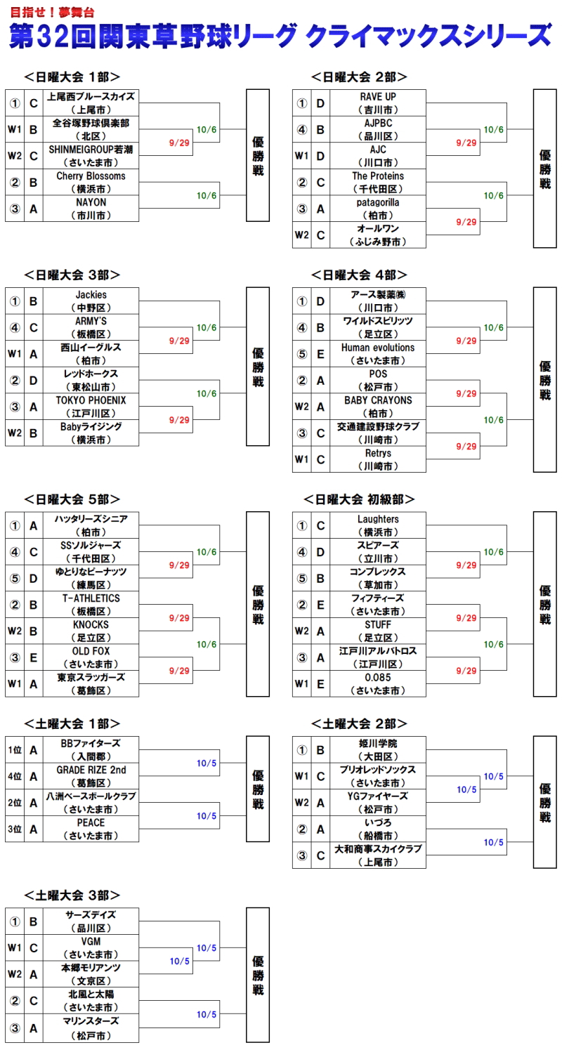 | 第32回関東草野球リーグは 9月22日(日)にレギュラーシーズン全日程を終了し、 優勝戦進出チーム決定戦(通称・クライマックスシリーズ) に進出する全52チームが出揃った。 その顔ぶれを見渡すと、 さすがに一年間の激戦を勝ち抜いてきたチーム同士とあって、 どのチームもチャンスは十分。 優勝戦進出の切符をかけた争いは熾烈を極めそうだ。 そんな中、注目の組み合わせが下記の通り決まった。 試合は、土曜大会は10/5(土)、 日曜大会は9/29(日)と10/6(日)の2日間の日程に分けて行われ、 今年度関東草野球リーグ優勝戦に進出するすべてのチームが決まる。 |