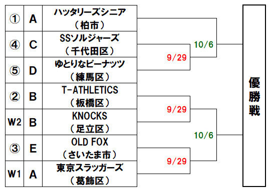 | 実力が拮抗し勝負強いチームが揃う激戦区となった。レギュラーシーズンを1位で通過したハッタリーズシニア(柏市)は御年54歳を迎える前園が毎試合のように盗塁を決めるなどベテラン揃いだが元気いっぱいだ。SSソルジャーズ(千代田区)は左腕エース・梅澤らレベルの高い投手が揃う。SSソルジャーズと1回戦で対戦するゆとりなピーナッツ(練馬区)は昨年もCSに出場しあと1勝でプロスタを逃した悔しさを今年何としても晴らしたいところ。下段のT-ATHLETICS(板橋区)とKNOCKS(足立区)は1回戦屈指の好カード。T-ATHLETICSはどこからでも長打が飛び出す打線が魅力で空中戦に強い。KNOCKSは防御率0点のエース武田を擁し打線も主砲・橋本を軸に強力で好ゲームが期待できそうだ。OLD FOX(さいたま市)は染谷―渡辺のバッテリーを中心に投打にまとまっておりダークホース的な存在で不気味だ。対する東京スラッガーズ(葛飾区)は強力打線が自慢。終盤までもつれる打撃戦に持ち込みたい。 |