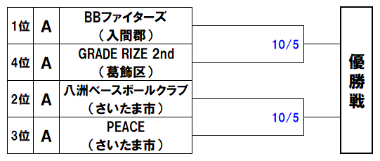 | レギュラーシーズンを1位で通過したアース製薬(川口市)を崩すのは簡単ではない。安定感のあるエース・菅澤に4部大会屈指の強力打線を擁し優勝候補の筆頭だ。2位通過のPOS(松戸市)は若林、石塚の1・2番コンビの出塁が優勝戦進出のカギを握る。そのPOSと初戦で対戦するのは同グループのBABY CRAYONS(柏市)。レギュラーシーズンでは対戦が無かっただけに真のグループ優勝も掛かる一戦だ。上段のHuman evolutions(さいたま市)は投打に躍動するエース・松本の活躍に期待。対するワイルドスピリッツ(足立区)はリーグの初戦こそ黒星を喫したが、その後9連勝でCSの切符を掴んだ勢いは驚異的。下段の1回戦、全員野球が信条の交通建設野球クラブ(川崎市)と名将・羽田野監督率いるRetrys(川崎市)の一戦はレギュラーシーズンでは5-5の引き分け。CSで雌雄を決し弾みをつけたい。 |
