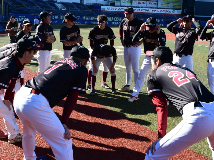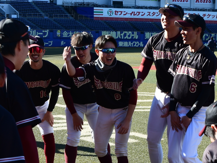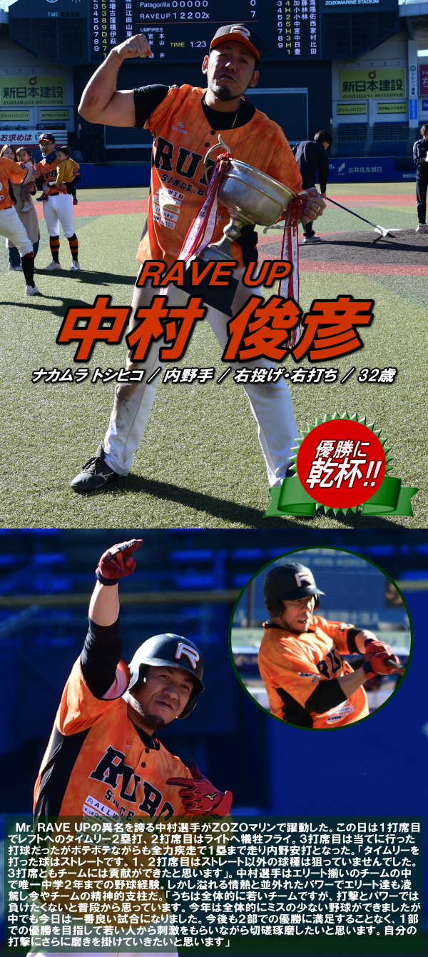 | 「試合には負けましたが、最後までマリンスタジアムを満喫することができました。またプロスタで全員が出場することができて満足です。教え子達とマリンで試合ができたので、今後の人生的にも良い思い出になると思います。相手のRAVE UPさんは強敵でしたが、最後まで気を抜かずにプレーをしていただき感謝しています。今日の試合はコールド負けでしたが、シーズンを通してうちらしい野球ができたと思います。来年も若手を入れるなどメンバーを補強して、1部の試合でも良い結果が残せればと思います」 |