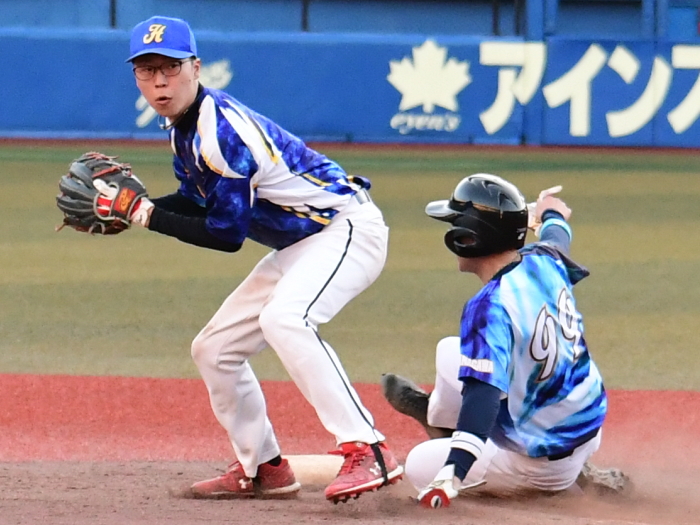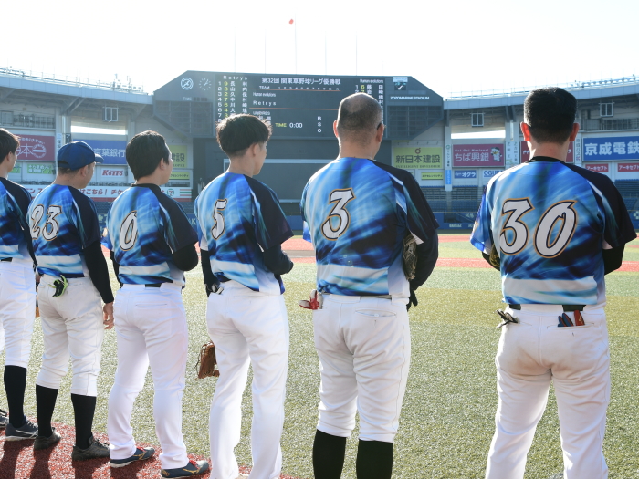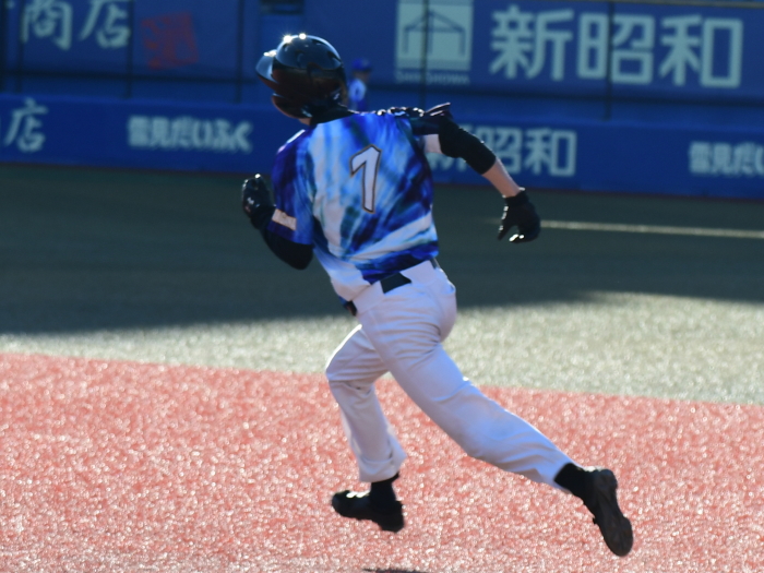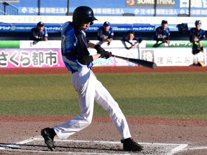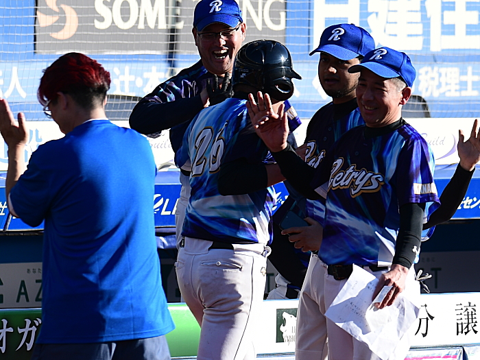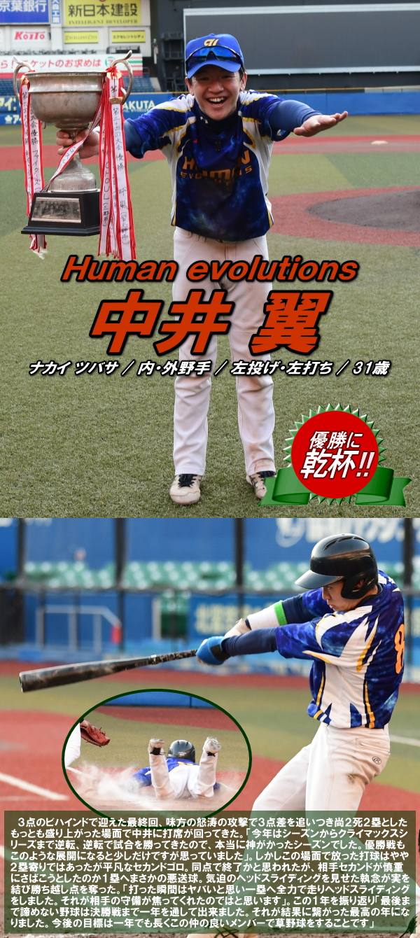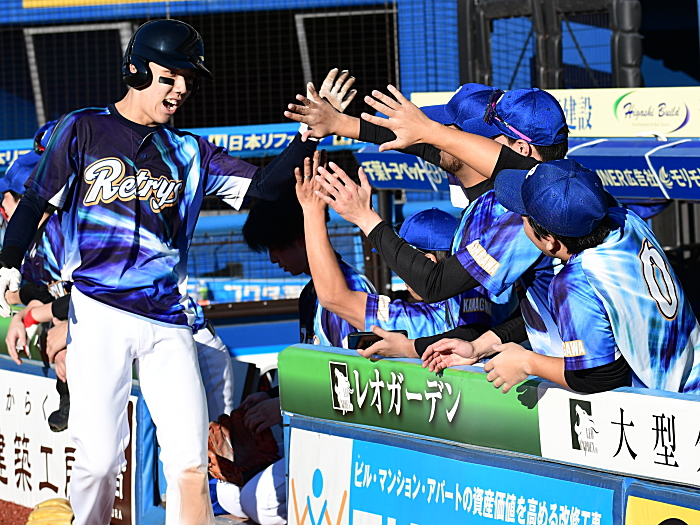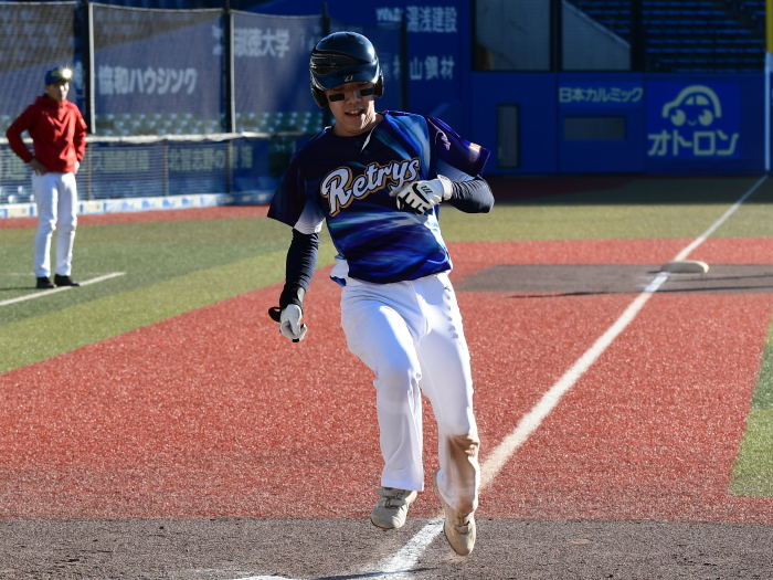 | Retrysは2回、4番中村がヒットで出塁するとその後2盗を決めて無死2塁のチャンスを作る。ここで迎えた5番川崎がライト前にタイムリーヒットを放ち1点を先制。Retrysはその後に内野ゴロの間に1点を追加し、なおも連打で1死1、2塁とするとこの好機に9番田那辺がセンターオーバーのランニング3ランホームランを放ちこの回計5点を奪うビッグイニングを作る。5点を追うHuman evolutionsの反撃は直後の3回。8番林田がレフト前ヒット、1番藤田の2塁打などで2死1、3塁のチャンスを作ると、3番橋のタイムリーヒットと失策絡みからまず2点を返す。さらにその後も相手失策絡みからもう1点を追加し3−5と2点差に詰め寄る。追い上げられ追加点を奪いたいRetrysは4回、1死から1番長利、2番山内が連続安打で出塁すると、3番久保のセンター前タイムリーや失策絡みで2点を奪い7−3と再びリードを広げる。終盤に向け少しでも点差を詰めておきたいHuman evolutionsは5回、この回先頭の1番藤田がマリンスタジアムのライトスタンドへ叩き込む豪快なソロホームランを放ち1点を返す。そして勢いづき迎えた最終の7回、Human evolutionsは8番島田のヒットや四球などで1死1、3塁とすると、2番岩崎がセンターオーバーの2点タイムリー3塁打を放ち、6−7と1点差に詰め寄る。その後、走者を3塁に置き迎えた3番新田の放った打球が内野のフィルダースチョイスを誘い3塁走者がホームイン。最終回の土壇場で7−7の同点に追いつく。Human evolutionsはさらに2死後、走者を2塁に置き5番中井の当たりはセカンドゴロ。チェンジかと思われたが全力疾走と気迫のヘッドスライディングで相手の守乱を誘い、その間に2塁走者がホームイン。8−7とついに逆転に成功する。結局試合はその裏のRetrysの反撃を抑えたHuman evolutionsが驚異的な大逆転で制した。 |