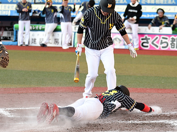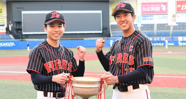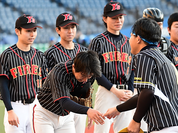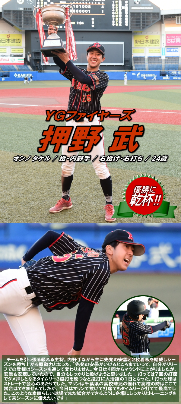 | 先制したのはYGファイヤーズ。2回、1死から5番三澤がセンターオーバーの3塁打で出塁。続く6番堀江が四球を選ぶと、すかさず2塁へ盗塁を決めて1死2、3塁のチャンスを作る。ここで迎えた7番芝田がレフトへ犠牲フライを放ち1点を先制する。先制された大和商事スカイクラブの反撃は3回。1死から9番水谷がレフトへ2塁打を放ちスコアリングポジションに走者を置く。しかし後続が打ち取られチャンスを逃す。追加点を奪いたいYGファイヤーズは4回、2つの四球とエラーで1死満塁とすると、9番川高がきっちりと犠牲フライを放ち、追加点となる2点目を奪う。7回には1番菅がレフト前ヒットで出塁し1死後、3番押野がタイムリー3塁打、さらに送球ミスが重なり打った押野も本塁へ生還して2点を追加、4−0とリードを広げる。後の無い大和商事スカイクラブはその裏、1死から代打の岡本が2塁打で出塁すると続く6番袴田も死球で出塁し1死1、2塁の好機を作る。その後2塁走者の岡本が3盗、この時捕手の悪送球を誘いこの間にようやく1点を返す。しかし反撃もここまで。YGファイヤーズがワイルドカード枠からの出場で一気に頂点を掴んだ。 |