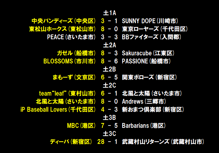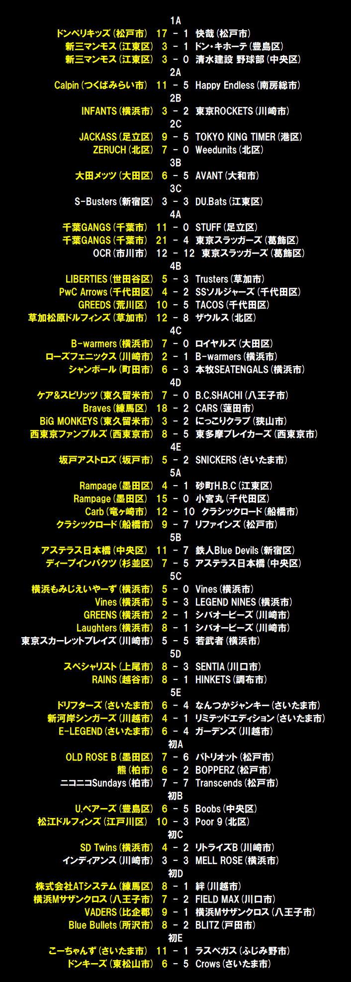 | Weedunitsは初回、2番・佐藤がヒットで出塁するとすかさず2盗を決め1死2塁のチャンスをつかむが後続が倒れ無得点。一方のZERUCHはその裏、連続ヒットで無死1・2塁の好機に3番・末岡がライトオーバーの2塁打を放ち、鮮やかな3連打でまず1点を先取。さらに相手ミスなどで得点を加え、結局この回5安打を集中させ一挙4点を先制した。勢いづいたZERUCHはその後も相手エラーを絡め着々と追加点を挙げると、投げては藤村から鯉沼へとつなぐリレーでWeedunits打線を1安打に抑え0封。攻守に完勝した。 |
