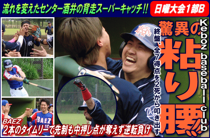 | BAEZは2回1死から5番・菊池がライト線への3ベースで出塁すると、続く6番・大東が右中間へタイムリー2ベースを放ちまず1点。さらに2死3塁から8番・濱田にもタイムリーが飛び出し、この回2点を先取する。BAEZは4回には1死1塁から、先ほど先制打の6番・大東が放った打球はセンターの頭上を襲う大飛球。長打コースかと思われたが、これをKeboz baseball clubのセンター酒井が背走しながらのジャンピングキャッチで好捕。さらに飛び出した1塁ランナーも刺されダブルプレーで追加点を奪えない。このプレーで流れをつかんだKeboz baseball clubは直後の5回に反撃を開始。連続ヒットと送りバントで2死ながら2・3塁とすると、3番・河野の振り逃げでまず1点。さらに4番・田畑のタイムリーで試合を振り出しに戻した。Keboz baseball clubは6回には、またしても2死ながら2・3塁のチャンスを作ると、ここで2番・瀬戸がレフト前へ値千金のタイムリーを放ち、ついに勝ち越しに成功。その後相手エラーなどでさらに加点し勝負を決めた。 |