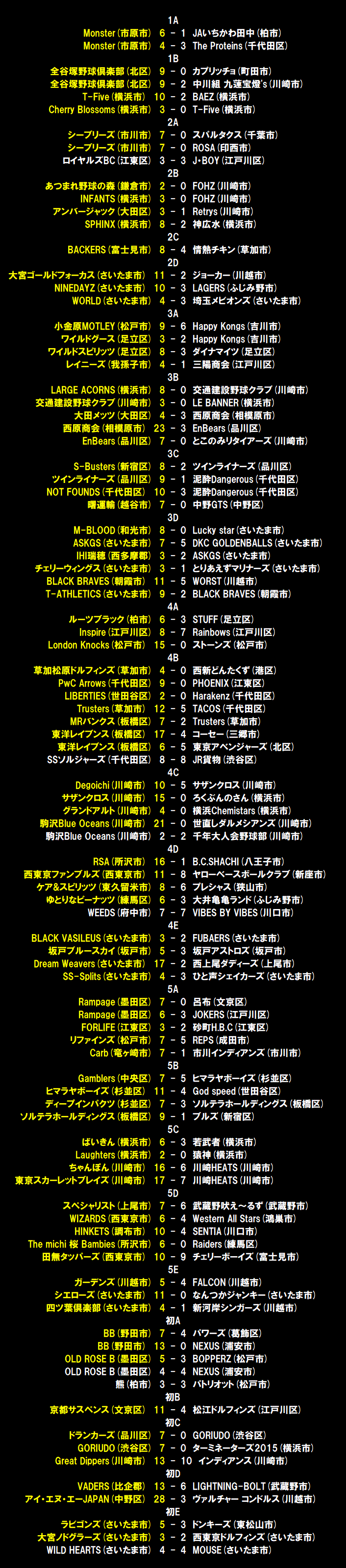 | 互いにここまで3連勝のチーム同士の注目の一戦はBLACK VASILEUSに軍配が上がった。BLACK VASILEUSは2回、死球のランナーを2塁に置き、9番・長山のセンターオーバーのタイムリー2ベースで1点を先制。FUBAERSは直後の3回2死から連打と死球で満塁とすると、4番・村本の放った打球は左中間への飛球。これをレフトがグラブに当てながらも惜しくも捕球できずこの間に2者が生還し、FUBAERSが逆転に成功した。追うBLACK VASILEUSFUBAERSの反撃は4回。1死後、6番・畑中が内野安打で出塁すると、続く7番・神庭(かんば)がカウント2-2からの真っ直ぐをとらえるとこれがレフトオーバーの2ランホームランとなり再びリードを奪った。あとがなくなったFUBAERSも最終回、この回先頭の2番・中村がセンター前ヒットで出塁すると3番・園部も四球で続き無死1・2塁と最後のチャンスを作る。しかし期待の中軸がBLACK VASILEUSの先発・湊の前に相次ぎ打ち取られゲームセット。BLACK VASILEUSFUBAERSが競り勝った。 |