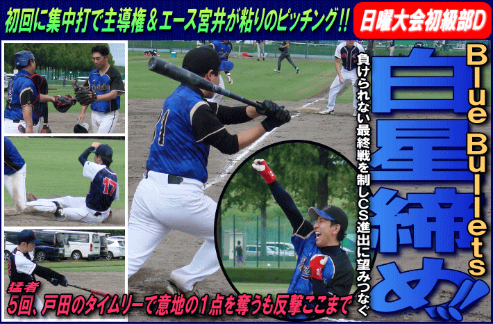 Bulletsのベテランエース宮井の前に毎回ランナーを出塁させるも決め手を欠き4回まで無得点。5回に9番・磯部のヒットを足がかりに2番・戸田のタイムリー2ベースで1点を返すも反撃ここまで。最終戦を快勝したBlue